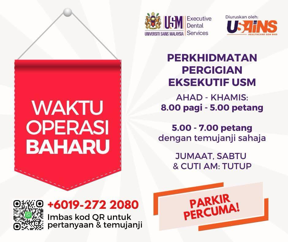 WAKTU OPERASI PERKHIDMATAN PERGIGIAN EKSEKUTIF USM kini beroperasi selepas waktu berkerja.