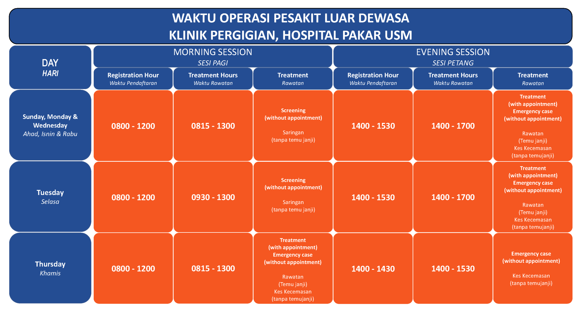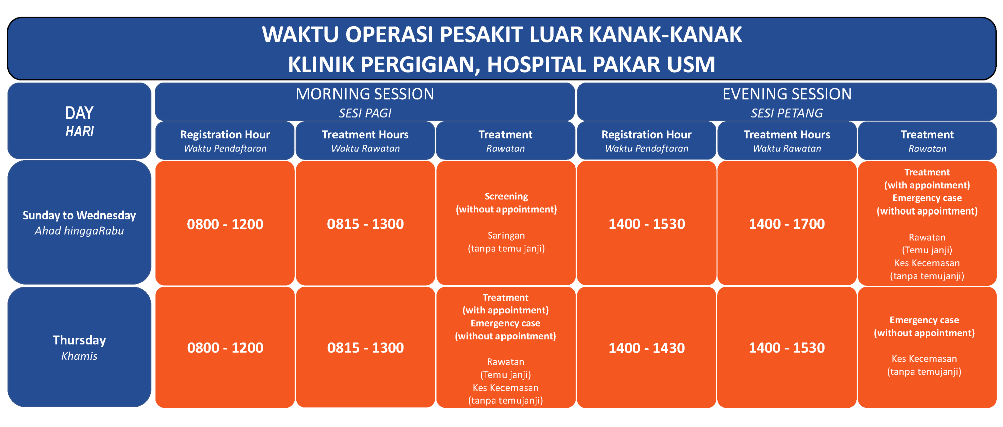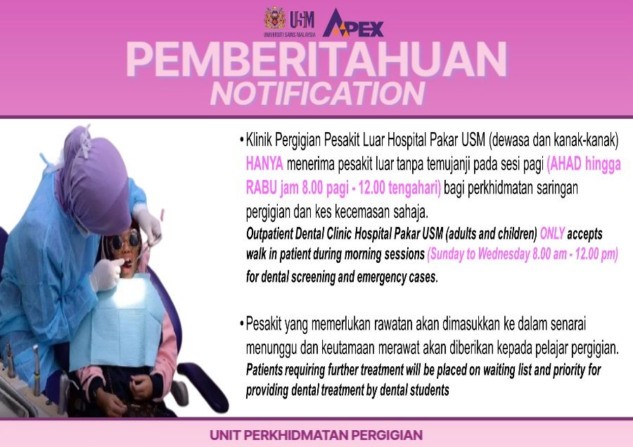 Hospital Pakar USM outpatient clinic is located at the main dental clinic on the ground floor of PPSG building for General Dental Family Clinic (KRK-G) and General Paediatric Dental Clinic. These outpatient clinics offer a wide range of dental treatment and consultation to the public as well as the USM staff.